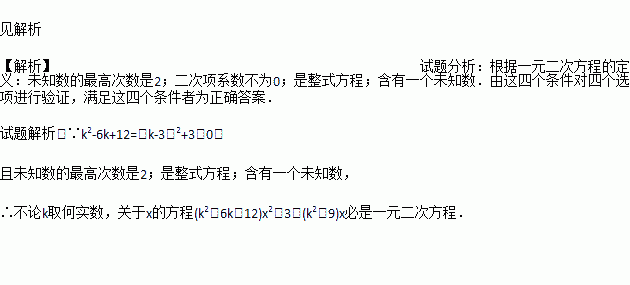 试证:不论k取何实数,关于x的方程 (k2 -6k +12)x2 = 3 - (k2 -9)x必是一元二次方程.