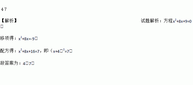 4 7 【解析】试题解析:方程x2+8x+9=0, 移项得:x2+8x=-9, 配方得:x2+8x+16=7,即(x+4)2=7. 故答案为:4;7.