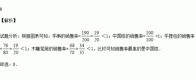 今年5月21日是全国第27个助残日,某地开展“心手相连,共浴阳光”为主题的手工制品义卖销售活动.长江特殊教育学校将同学们手工制作的手串、中国结、手提包、木雕笔筒的相关销售信息汇总如下表,其中销售率最高的是( )