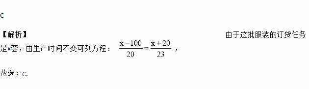某制衣厂计划若干天完成一批服装的订货任务,如果每天生产服装20套,那么就比订货任务少生产100套,如果每天生产服装23套,那么就可超过顶货任务20套,设这批服装的订货任务是x套,根据题意,可列方程()