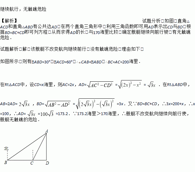 如图,我国巡逻舰在南海B处例行巡逻,测得小岛A在舰艇的北偏东60o的方向,巡逻舰从B地继续向正东方向航行200海里到达C处时,测得小岛A在舰艇的北偏东30o的方向。已知在小岛周围170海里内有暗礁,若舰艇不改变航向继续向前行驶,试问舰艇有无触礁的危险?(