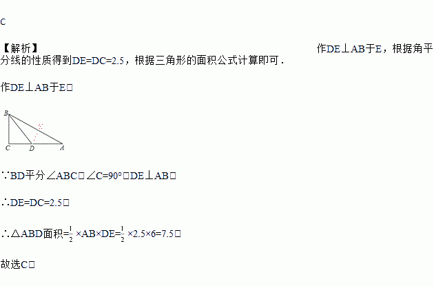 如图,在ΔABC中,∠C=90°,BD平分∠ABC, 若CD=2.5,AB=6,则ΔABD的面积为( )