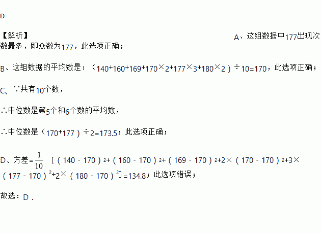 A. 众数是177 B. 平均数是170 C. 中位数是173.5 D. 方差是135