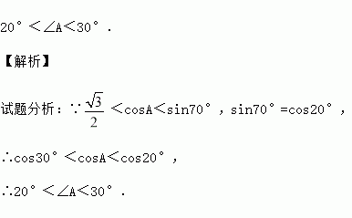 <cosA<sin70°,则锐角A的取值范围是 .