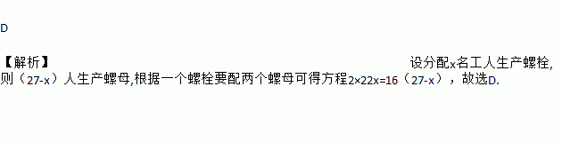 某车间有27名工人,生产某种由一个螺栓套两个螺母的产品,每人每天生产螺母16个或螺栓22个,若分配x名工人生产螺栓,其他工人生产螺母,恰好使每天生产的螺栓和螺母配套,则下面所列方程中正确的是( )