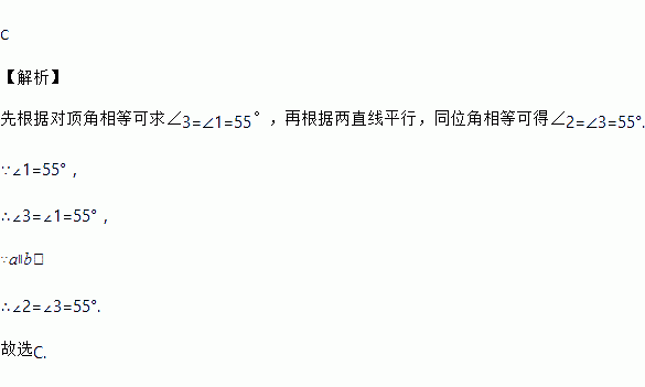 如图,直线a,b被直线c所截,且a∥b,若∠1=55°,则∠2的度数为( )