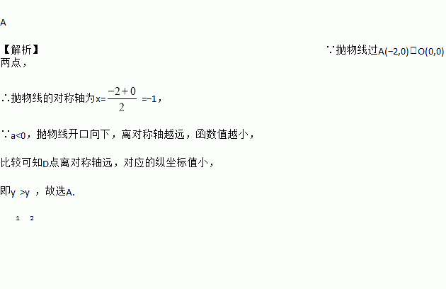 A 【解析】∵抛物线过A(?2,0)、O(0,0)两点, ∴抛物线的对称轴为x==?1, ∵a<0,抛物线开口向下,离对称轴越远,函数值越小, 比较可知D点离对称轴远,对应的纵坐标值小, 即y₁>y₂,故选A.