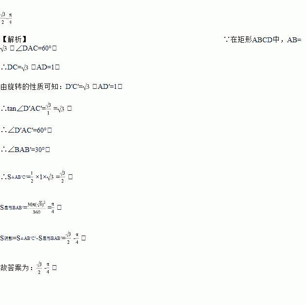 ,AD=1,把该矩形绕点A顺时针旋转α度得矩形AB′C′D′,点C′落在AB的延长线上,则图中阴影部分的面积是 .