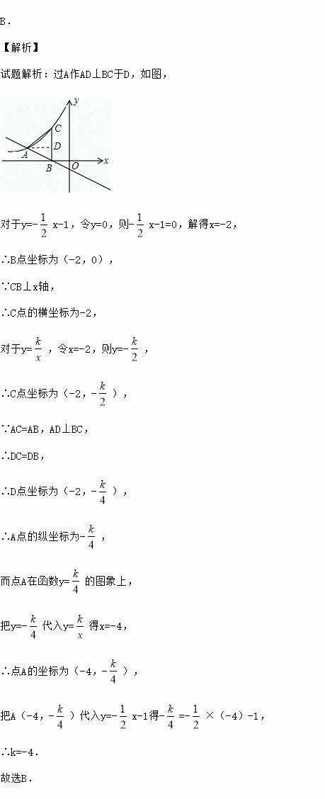 直线y=-x-1与反比例函数(x<0)的图象交于点A,与x轴相交于点B,过点B作x轴垂线交双曲线于点C,若AB=AC,则k的值为( )