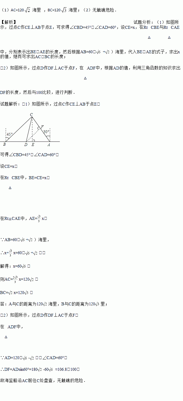 (2)已知在灯塔D周围100海里范围内有暗礁群,我在A处海监船沿AC前往C处盘查,途中有无触礁的危险?