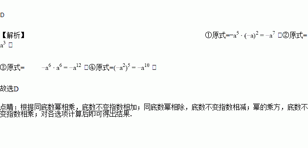 在①-a5·(-a)2;②(-a6)÷(-a3);③(-a2)3·(a3)2;④[-(-a)2]5中计算结果为-a10的有( )