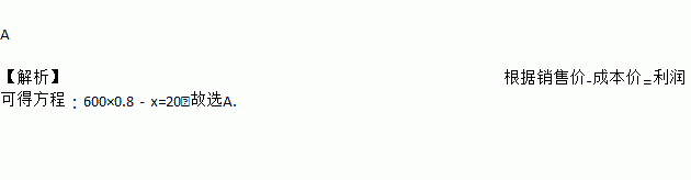 A 【解析】根据销售价-成本价=利润可得方程:600×0.8﹣x=20,故选A.