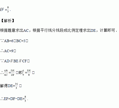 如图,AD∥BE∥CF,AB=6,BC=3,DF=8,求EF的长.
