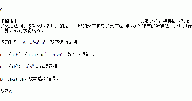 C 【解析】试题分析:根据同底数幂的乘法法则、多项乘以多项式的法则、积的乘方和幂的乘方法则以及代理商的运算法则逐项进行计算,即可求得答案. 试题解析:A、a2•a3=a5,故本选项错误; B、(a+b)(a-2b)=a2—ab-2b2,故本选项错误; C、(ab3)2=a2b6,本选项正确; D、5a-2a=3a,故本选项错误. 故选C.
