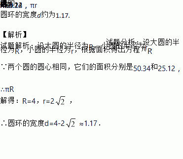 两个圆的圆心相同,它们的面积分别是25.12和50.24.求圆环的宽度d.(π取3.14,结果保留小数点后两位)