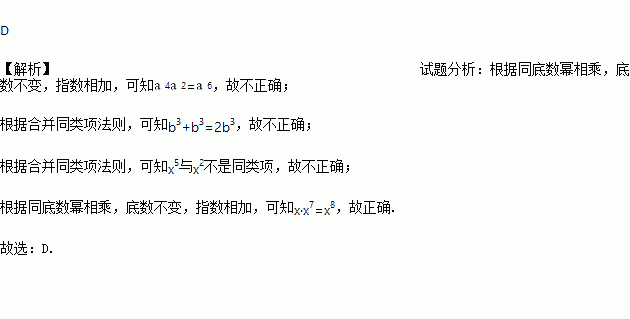 A. 42=8 B. b3+b3=b6 C. x5+x2=x7 D. x x7=x8