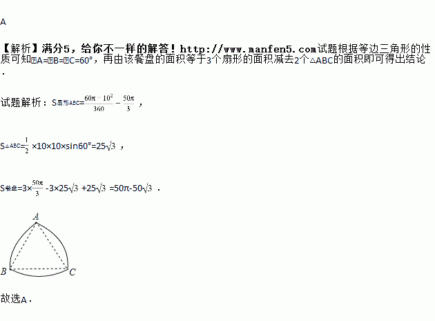 如图是一个餐盘,它的外围是由以正三角形的顶点为圆心,以正三角形的边长为半径的三段等弧组成,已知正三角形的边长为10,则该餐盘的面积是( )