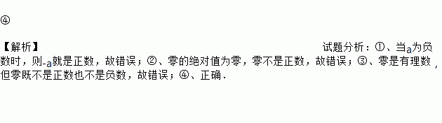 ④ 【解析】试题分析:①、当a为负数时,则-a就是正数,故错误;②、零的绝对值为零,零不是正数,故错误;③、零是有理数,但零既不是正数也不是负数,故错误;④、正确.