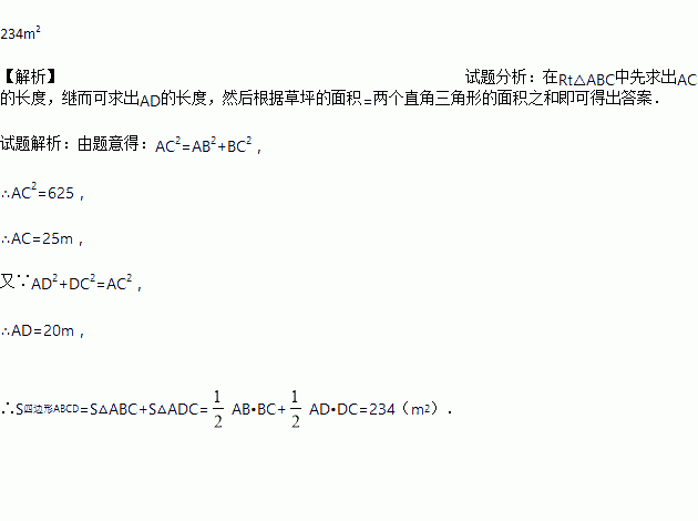 如图,有一块四边形草坪,∠B=∠D=90°,AB=24m,BC=7m,CD=15m,试求草坪面积.(5分)