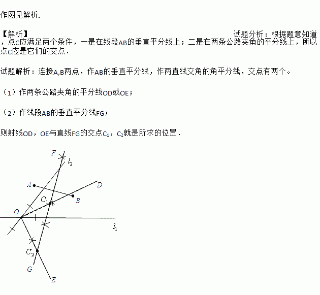 如图,有公路l1同侧、l2异侧的两个城镇A,B,电信部门要在S区修建一座信号发射塔,按照设计要求,发射塔到两个城镇A,B的距离必须相等,到两条公路l1,l2的距离也必须相等,发射塔C应修建在什么位置?请用尺规作图找出所有符合条件的点,注明点C的位置.(保留作图痕迹,不写作法)