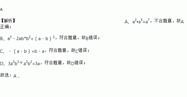 A. a2•a5=a10 B. a2﹣2ab+b2=(a﹣b)2