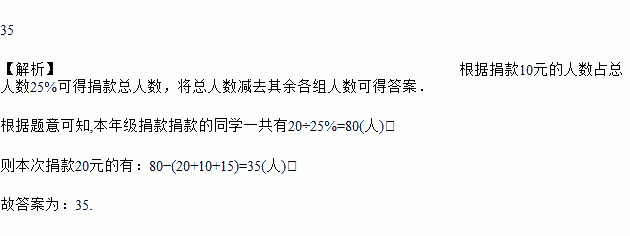 在某公益活动中,小明对本年级同学的捐款情况进行了统计,绘制成如图所示的不完整的统计图,其中捐10元的人数占年级总人数的25%,则本次捐款20元的人数为______ 人.