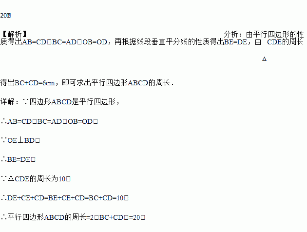 如图,平行四边形ABCD的对角线相交于点O,且AB≠AD,过O作OE⊥BD,交BC于点E,若△CDE的周长为10,则平行四边形ABCD的周长是多少?