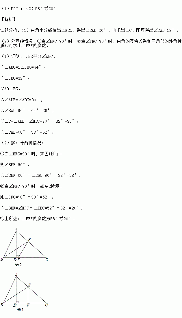 如图,△ABC中,AD⊥BC于点D,BE平分∠ABC,若∠ABC=64°,∠AEB=70°.