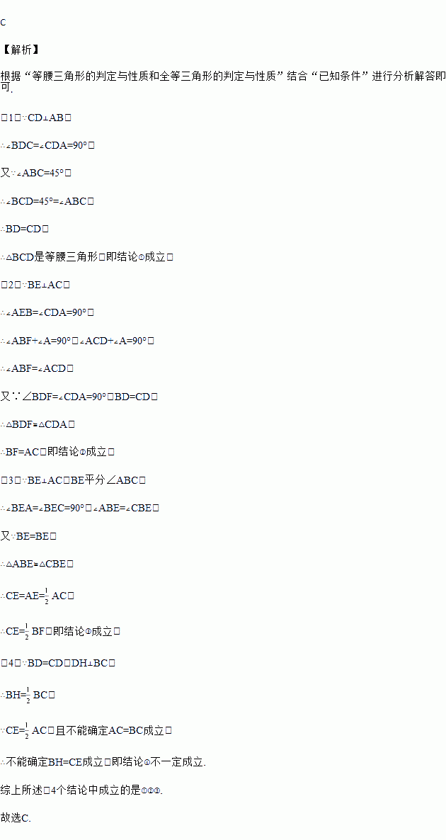 如图,△ABC中,∠ABC=45°,CD⊥AB于D,BE平分∠ABC,且BE⊥AC于E,与CD相交于点F,DH⊥BC于H,交BE于G,下列结论中正确的是( )
