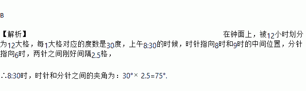 B 【解析】在钟面上,被12小时划分为12大格,每1大格对应的度数是30度,上午8:30的时候,时针指向8时和9时的中间位置,分针指向6时,两针之间刚好间隔2.5格, ∴8:30时,时针和分针之间的夹角为:30°2.5=75°.