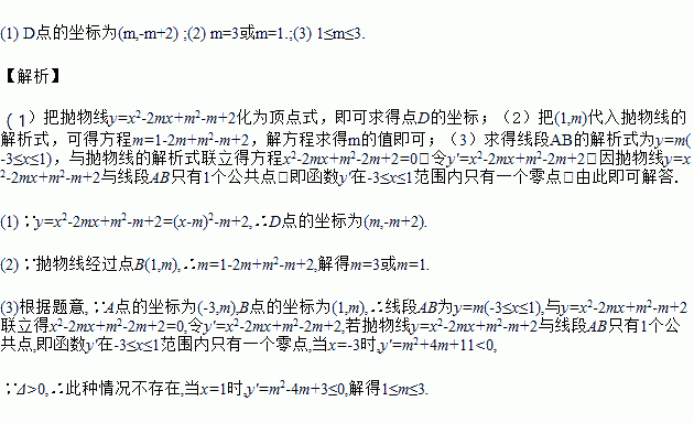 在平面直角坐标系xOy中,抛物线y=x2-2mx+m2-m+2的顶点为D.线段AB的两个端点分别为A(-3,m),B(1,m).