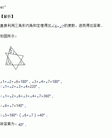 将两张三角形纸片如图摆放,量得∠1+∠2+∠3+∠4=220°,则∠5=_____.