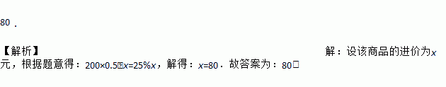 80. 【解析】【解析】 设该商品的进价为x元,根据题意得:200×0.5﹣x=25%x,解得:x=80.故答案为:80.