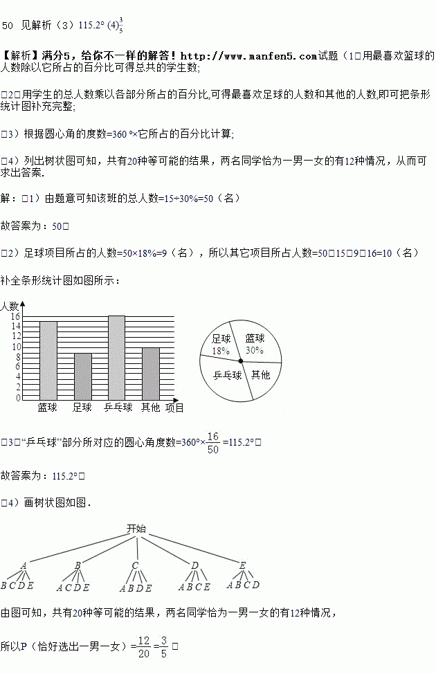 (4)学校将举办体育节,该班将推选5位同学参加乒乓球活动,有3位男同学(A,B,C)和2位女同学(D,E),现准备从中选取两名同学组成双打组合,用树状图或列表法求恰好选出一男一女组成混合双打组合的概率.