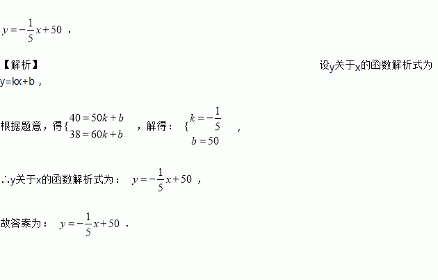 . 【解析】设y关于x的函数解析式为y=kx+b, 根据题意,得 ,解得: , ∴y关于x的函数解析式为: , 故答案为: .