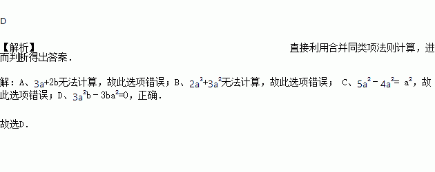 A. 3a+2b=5ab B. 2a3+3a2=5a5 C. 5a2﹣4a2=1 D. 3a2b﹣3ba2=0