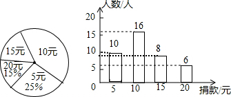 分析 (1)利用捐款20元的6人除以所占的百分比求得总人数,进一步求得捐款5元和15元的人数,补全条形统计图即可;