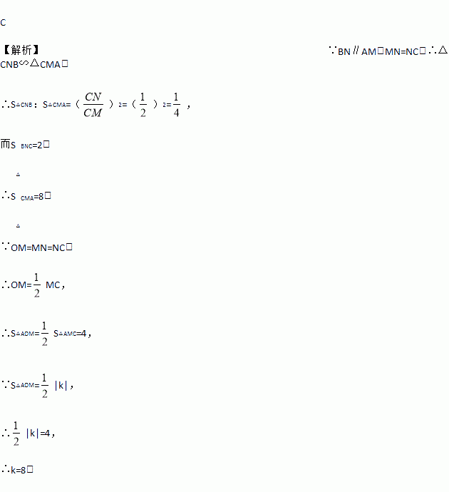 (k>0,x>0)的图象上,过点A、B作x轴的垂线,垂足分别为M,N,延长线段AB交x轴于点C,若OM=MN=NC,S△BNC=2,则k的值为( )