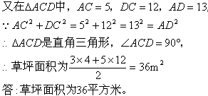 如图,四边形ABCD是一块草坪,量得四边长AB=3m,BC=4m,DC=12m,AD=13m,∠B=90°,求这块草坪的面积。![]()