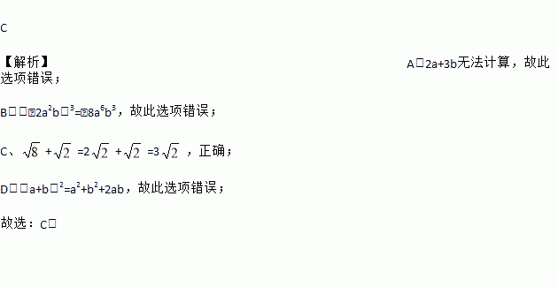 A. 2a+3b=5ab B. (﹣2a2b)3=﹣6a6b3 C. D. (a+b)2=a2+b2