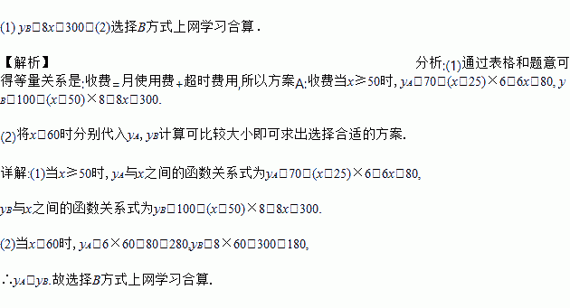 (2)若小明3月份上该网站学习的时间为60h,则他选择哪种方式上网学习合算?
