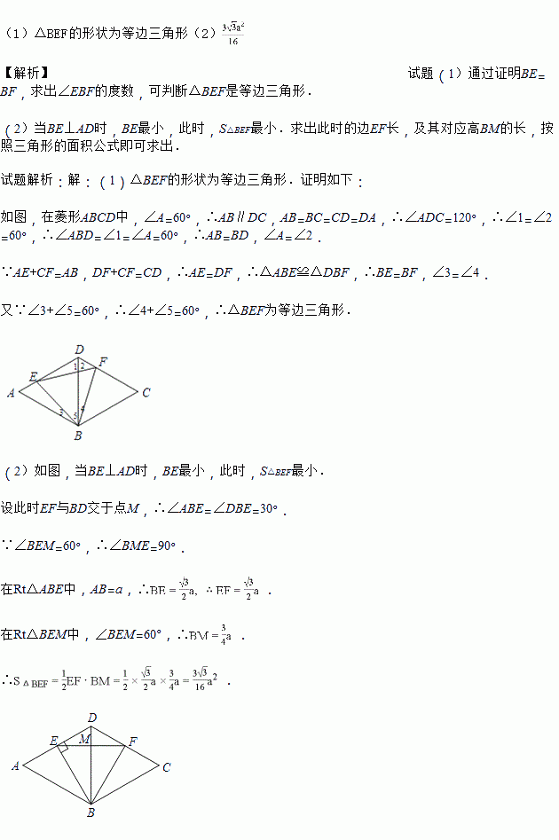 (2)在(1)的条件下,设菱形的边长为a,求△BEF面积的最小值.