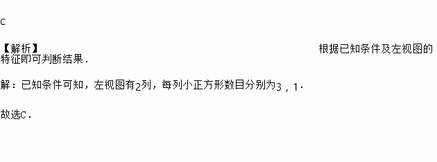 C 【解析】根据已知条件及左视图的特征即可判断结果. 【解析】 已知条件可知,左视图有2列,每列小正方形数目分别为3,1. 故选C.