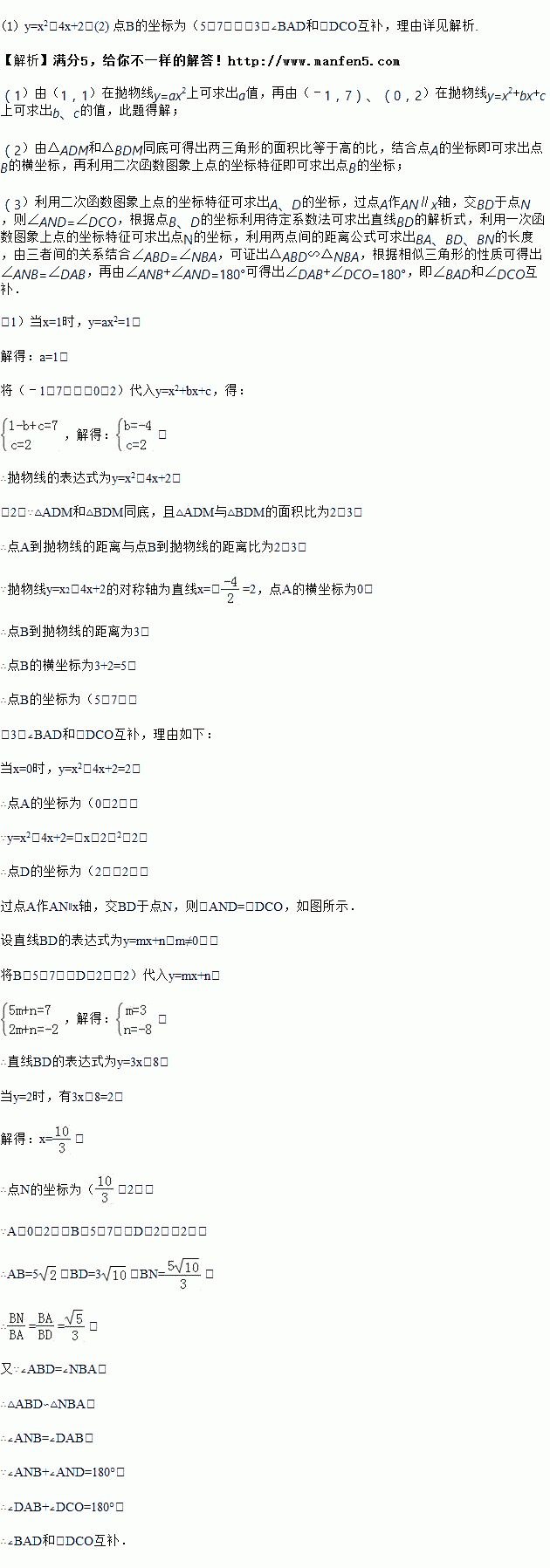(2)抛物线y=ax2+bx+c的顶点为D,与y轴的交点为A,点M是抛物线对称轴上一点,直线AM交对称轴右侧的抛物线于点B,当△ADM与△BDM的面积比为2:3时,求B点坐标;