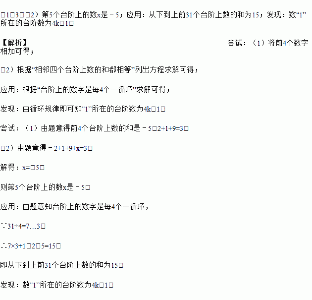 如图,阶梯图的每个台阶上都标着一个数,从下到上的第1个至第4个台阶上依次标着﹣5,﹣2,1,9,且任意相邻四个台阶上数的和都相等.