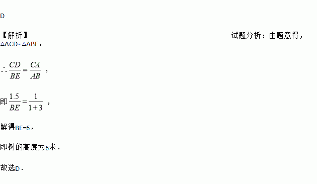 D 【解析】试题分析:由题意得,△ACD∽△ABE, ∴, 即, 解得BE=6, 即树的高度为6米. 故选D.