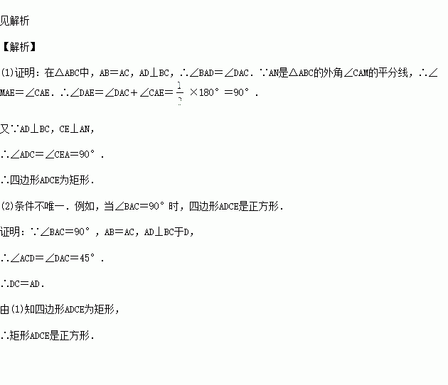 (2014贵州安顺)已知:如图,在△ABC中,AB=AC,AD⊥BC,垂足为点D,AN是△ABC外角∠CAM的平分线,CE⊥AN,垂足为点E.