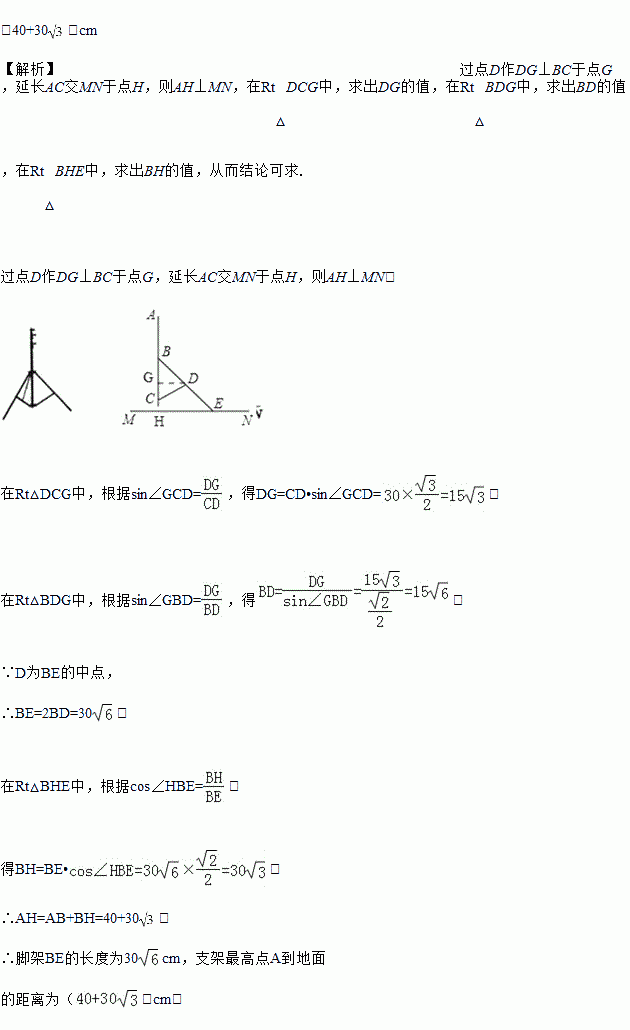 某数码产品专卖店的一块摄像机支架如图所示,将该支架打开立于地面MN上,主杆AC与地面垂直,调节支架使得脚架BE与主杆AC的夹角∠CBE=45°,这时支架CD与主杆AC的夹角∠BCD恰好等于60°,若主杆最高点A到调节旋钮B的距离为40cm.支架CD的长度为30cm,旋转钮D是脚架BE的中点,求脚架BE的长度和支架最高点A到地面的距离.(结果保留根号)