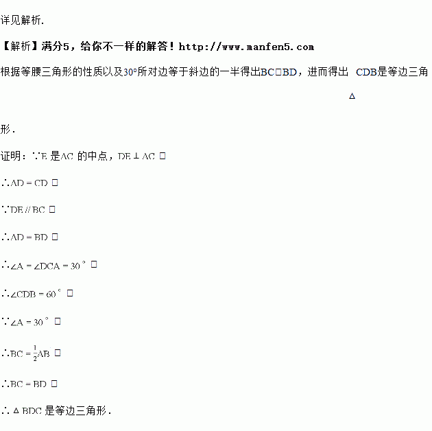 如图,已知中,,,是的中点,,交于,连接.求证:是等边三角形.