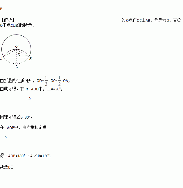 将半径为3 cm的圆形纸片沿AB折叠后,圆弧恰好能经过圆心O,则∠AOB的度数为( )